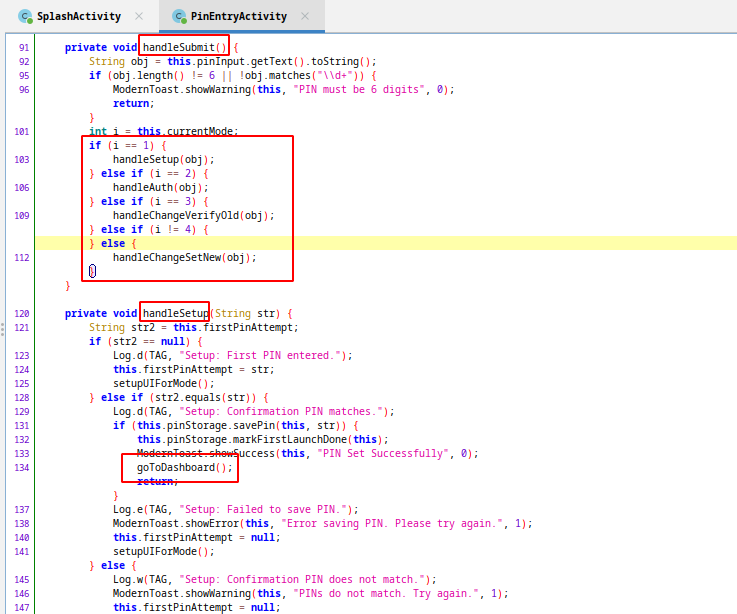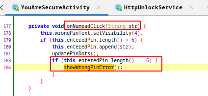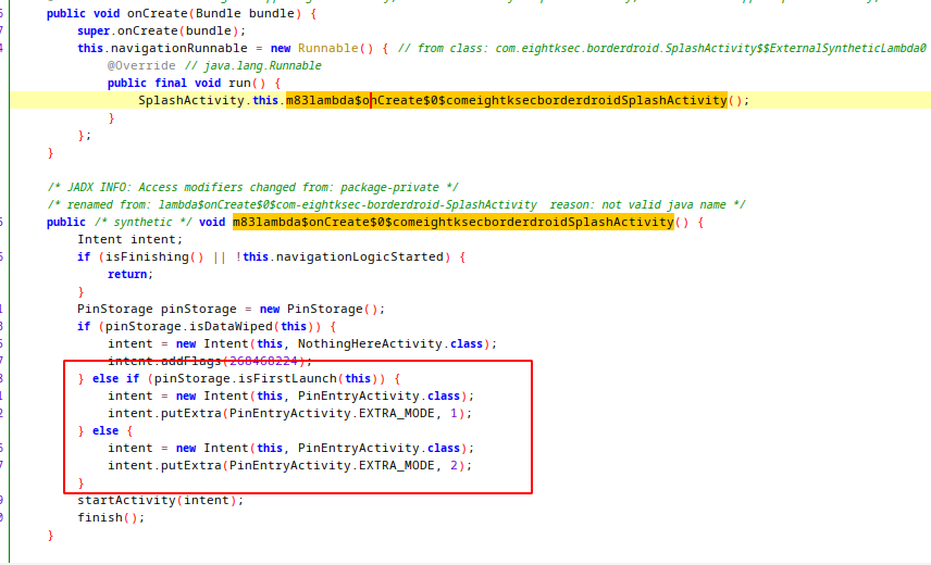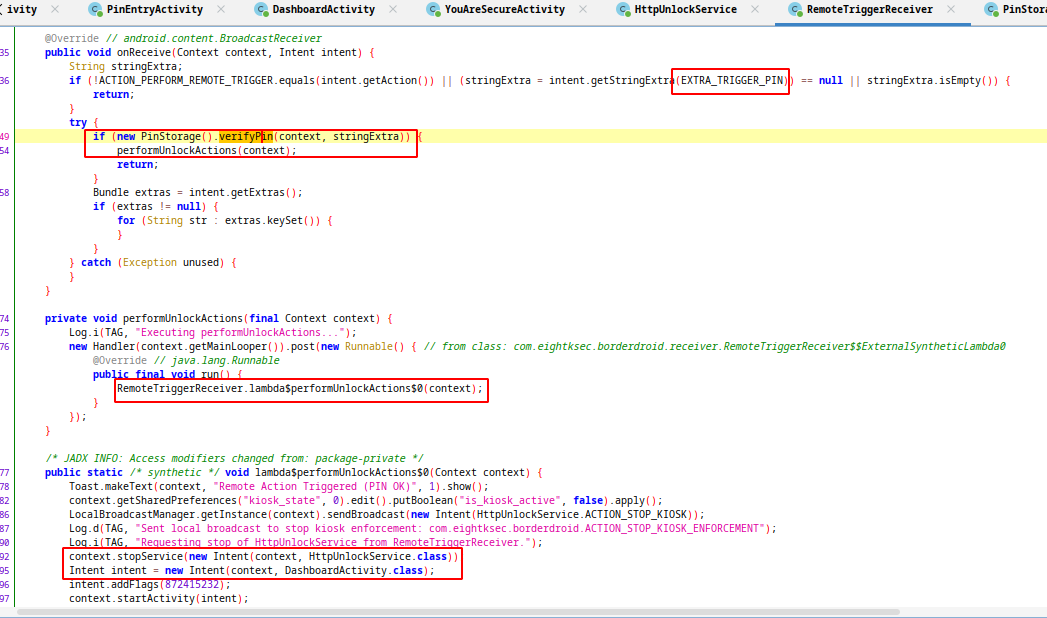 BorderDroid app is a kiosk app. First, we gave all requested permissions(accesibility etc.), set a pin for it and we can use it as kiosk mode. On kiosk mode,navigation buttons are not working and we can only see a pin enterence screen but when we give a correct pin, app not accepting it and says its wrong. Lets start our analysis with jadx.