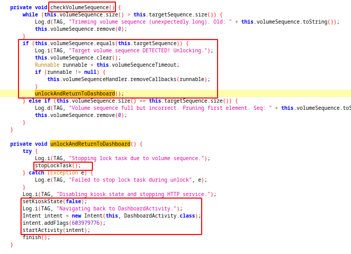 to unlock kiosk and also that receiver is exported in AndroidManifest.xml file. We can trigger this receiver with an intent and we can use this for bypassing kiosk.