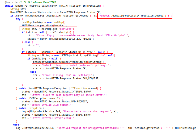 , pin send as json data and request method is POST, it calls another method(broadcastVulnerableUnlockIntentWithPın). This method create intent for RemoteTriggerReceiver