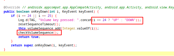 array for volume up and volume down button presses and calls checkVolumeSequence